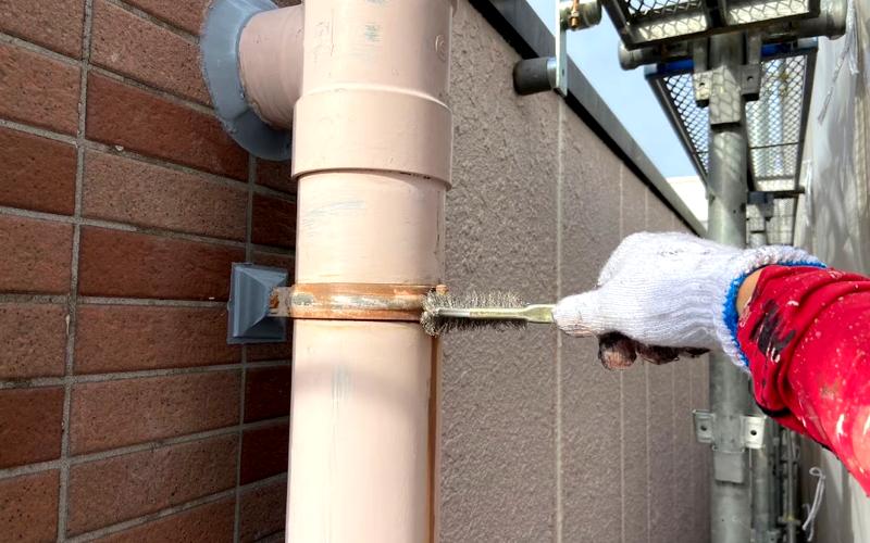 配管の留め金具部分に発生している錆や劣化した旧塗膜を、ワイヤーブラシを使用して丁寧に除去するケレン作業を行っています。塗装前に下地をしっかり整えることで塗料の密着性を高め、仕上がりの美しさと耐久性の向上につながる重要な工程です。