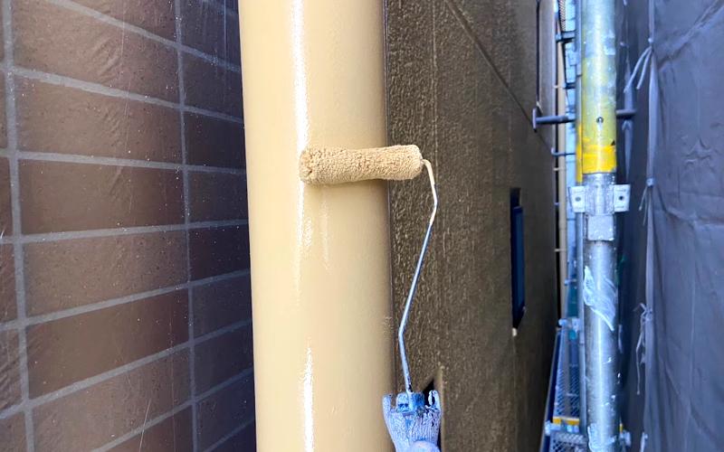 配管部分の上塗り作業を行っています。下地処理と下塗りで整えた状態の上に、仕上げ塗料を丁寧に塗布することで、塗膜に厚みと均一性を持たせています。これにより見た目がきれいに整うだけでなく、紫外線や雨風からの影響を受けにくくなり、耐久性の向上につながります。