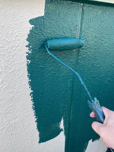 下塗りで整えた下地の上に、中塗りを行っています。中塗りは塗装工程の中でも重要な役割を持ち、塗膜の厚みをしっかり確保することで、外壁を紫外線や雨風から守る耐久性を高める工程です。ローラーを使用して均一に塗り広げることで、外壁の凹凸にもしっかりと塗料を行き渡らせ、ムラのない仕上がりの土台を作っています。この工程を丁寧に行うことで、最終的な上塗りの仕上がりがより美しくなり、長持ちする塗装につながります。