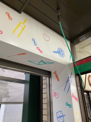 自転車屋さんの店舗に合わせて、外観にデザイン塗装を施しています。白を基調とした壁面に、自転車のフレームやチェーン、パーツなどをモチーフにしたカラフルなデザインを取り入れることで、遊び心のあるおしゃれな仕上がりになっています。通りからでも目を引くデザインにすることで、お店の存在感を高めるとともに、入りやすく親しみやすい雰囲気を演出しています。単なる塗装ではなく、お店のコンセプトに合わせた空間づくりとして、細部までこだわって施工しています。
