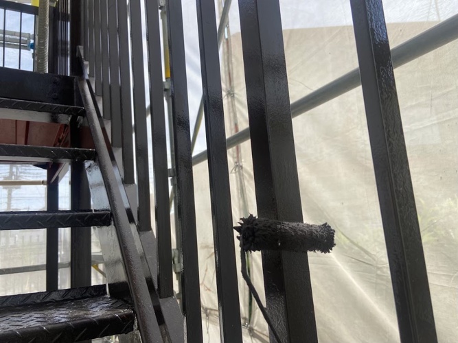手摺部分の仕上げとして、上塗りを行っています。錆止めおよび中塗りで整えた下地の上に塗料を重ねることで、色ムラのない均一な仕上がりとなり、艶のある美しい外観に仕上がります。細かな縦格子部分にもローラーで丁寧に塗料を行き渡らせることで、塗り残しやムラを防ぎ、しっかりとした塗膜を形成しています。また、上塗りにより紫外線や雨風から鉄部を保護し、防錆効果と耐久性をさらに高めています。見た目の美しさだけでなく、長く安心して使用できる状態に仕上げています。