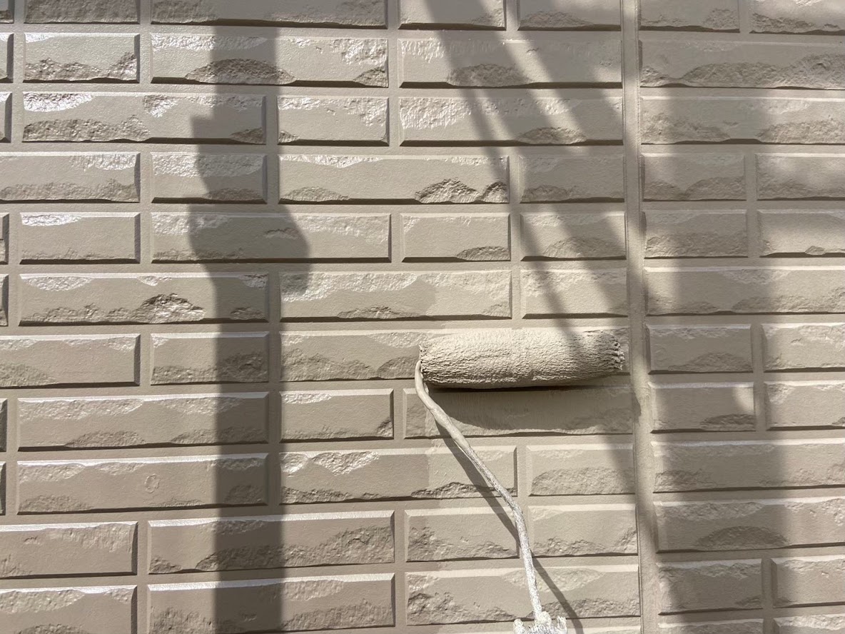 塗装工程の最初の工程として、外壁に下塗りを行っています。下塗りは仕上げ塗料をしっかり密着させるための重要な役割を持っており、下地の吸い込みを抑えながら塗料が均一に乗る状態を作ります。ローラーを使用して外壁の凹凸部分まで丁寧に塗り込むことで、ムラのない仕上がりの土台を形成しています。この工程をしっかり行うことで、その後の中塗り・上塗りの性能を最大限に引き出し、剥がれにくく長持ちする塗装につながります。