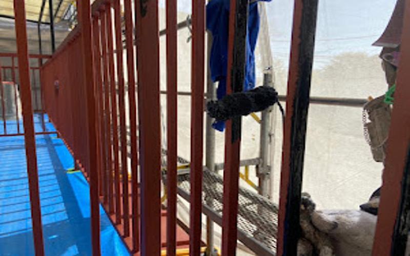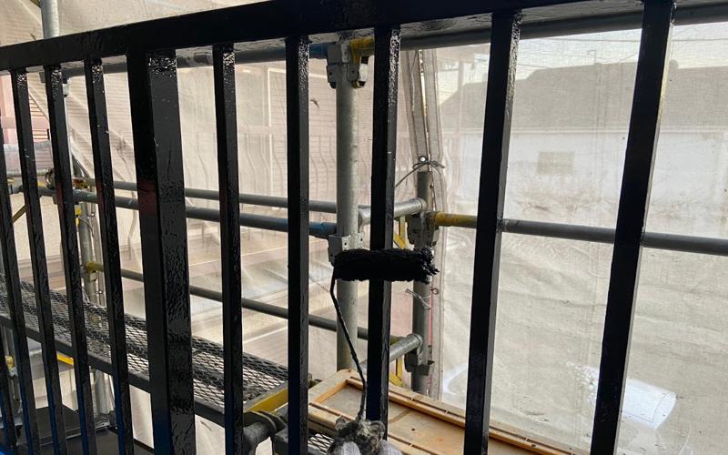 中塗りで整えた下地の上に、仕上げとなる上塗りを行っています。今回は五分艶仕上げのため、程よい艶感で落ち着いた印象に仕上げつつ、防錆性・耐久性もしっかり確保しています。塗り残しが出ないよう細部まで丁寧に施工しています。